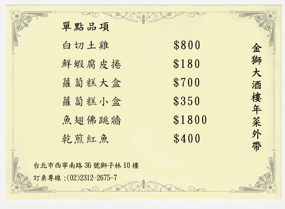 2 thoughts on “2026金獅大酒樓年菜外帶-單點品項